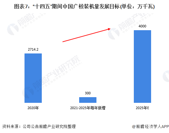 根據(jù)《十四五規(guī)劃和2035年愿景目標(biāo)綱要》,“十四五”期間,我國核電運(yùn)行裝機(jī)容量達(dá)到7000萬千瓦。中國廣核作為我國核電行業(yè)的龍頭企業(yè),也提出了其十四五發(fā)展目標(biāo):“十四五”期間,中國廣核將保持每年300萬千瓦以上發(fā)展速度,預(yù)計(jì)到“十四五”末,中廣核境內(nèi)新能源在運(yùn)裝機(jī)總?cè)萘繉⑼黄?000萬千瓦。