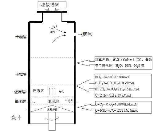 干燥后的垃圾逐漸降至熱解段,在控制的缺氧條件下有機(jī)物發(fā)生熱解,生成可燃?xì)怏w和灰渣。在熱分解段和氣化燃燒段分解成一氧化碳、氣態(tài)烴類等混合物進(jìn)入混合煙氣中。熱解氣化后的殘留物(液態(tài)焦油、較純的碳素及垃圾本身含有的無(wú)機(jī)灰土和惰性物質(zhì)) 進(jìn)入燃燒層充分燃燒。燃燒層沿高度方向可分為氧化區(qū)和還原區(qū)。
