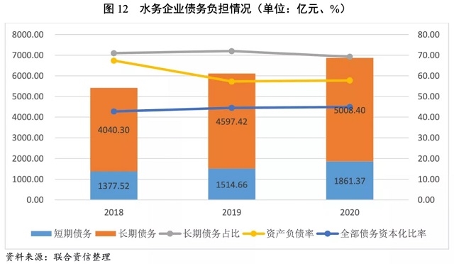 2018——2020年,水務(wù)企業(yè)整體資產(chǎn)負(fù)債率和全部債務(wù)資本化比率均小幅逐漸上升,2020年底分別為57.84%和44.97%,但跨區(qū)域投資和從事水利水電建設(shè)工程的水務(wù)企業(yè)債務(wù)負(fù)擔(dān)上升明顯,樣本中有約36%的企業(yè)資產(chǎn)負(fù)債率超過(guò)65%。
