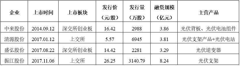 2013年至2017年期間,共有4家光伏制造企業(yè)在上交所及深交所創(chuàng)業(yè)版上市,融資金額均在3億元以上。從企業(yè)類(lèi)型看,上市企業(yè)主營(yíng)產(chǎn)品集中于光伏背板、光伏逆變器、光伏支架等產(chǎn)品,這與2013年以來(lái)中國(guó)光伏應(yīng)用市場(chǎng)的發(fā)展密不可分,下游光伏電站數(shù)量逐漸增多,項(xiàng)目規(guī)模不斷擴(kuò)大,電站建設(shè)需要的光伏組件、逆變器、支架等光伏產(chǎn)品需求隨之增長(zhǎng),相關(guān)光伏制造企業(yè)得以快速發(fā)展,滿(mǎn)足A股IPO上市條件。從上市時(shí)間看,這一時(shí)期光伏制造企業(yè)主要集中在2017年上市,2017年作為中國(guó)A股IPO大年,整體發(fā)行量創(chuàng)歷史新高,相較于2016年成功發(fā)行248家企業(yè),2017年上市企業(yè)共420家,同比增長(zhǎng)約69%,[39]整體較為火熱的發(fā)行市場(chǎng)為光伏制造企業(yè)IPO上市提供了較為良好的市場(chǎng)環(huán)境,助推了相關(guān)企業(yè)在資本市場(chǎng)獲得股權(quán)融資。