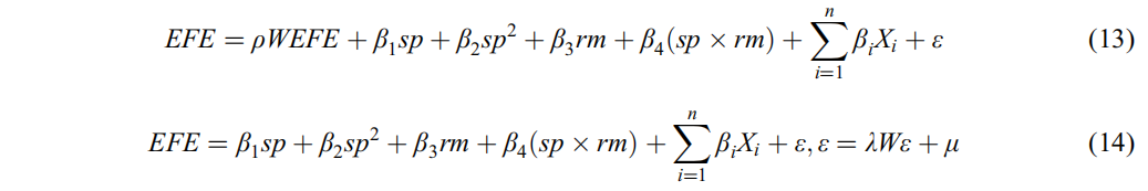 其中,EFE指生態(tài)效率;W為空間權(quán)重矩陣;μ表示隨機(jī)誤差項??刂谱兞堪夹g(shù)發(fā)展水平(tec)、人均土地承載力(ec)、自然人口增長率(pop)、產(chǎn)業(yè)所有制結(jié)構(gòu)(os)、互聯(lián)網(wǎng)普及率(int)、消費(fèi)水平(CPI)、政府調(diào)控經(jīng)濟(jì)的能力(gfe)、工業(yè)企業(yè)的環(huán)境保護(hù)程度(iep)。
