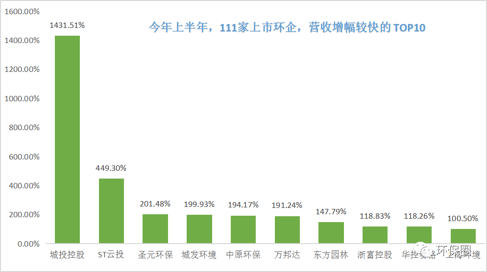 營收變動幅度方面,數(shù)據(jù)同樣喜人。111家上市環(huán)企,除了那些穩(wěn)步連續(xù)增長者,每年總有一些讓人意想不到的“黑馬”企業(yè)率先突圍出來,少則百分之幾百增長,多則百分之上千增長,成為上半年營收增速最快的10家先鋒企業(yè)。