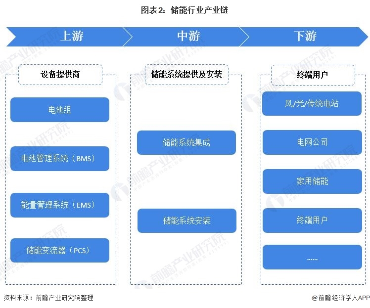 儲能產(chǎn)業(yè)鏈上游為電池、電池管理、能量管理系統(tǒng)以及儲能變流器供應(yīng)商;中游為儲能系統(tǒng)集成商、安裝商以及終端用戶等;下游為終端應(yīng)用客戶,包括風(fēng)/光/傳統(tǒng)電站、電網(wǎng)公司、家用儲能等。