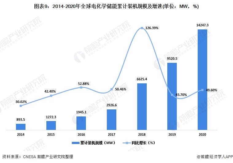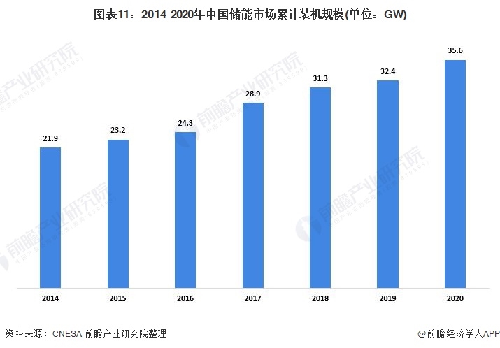 根據(jù)CNESA不完全統(tǒng)計,截至2020年底,中國已投運儲能項目累計裝機規(guī)模為35.6GW,占全球市場總規(guī)模的18.6%,同比增長9.8%,漲幅比2019年同期增長6.2個百分點。