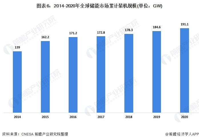 根據(jù)CNESA全統(tǒng)計,截至2020年底,全球已投運儲能項目累計裝機規(guī)模達到191.1GW,同比增長3.4%。