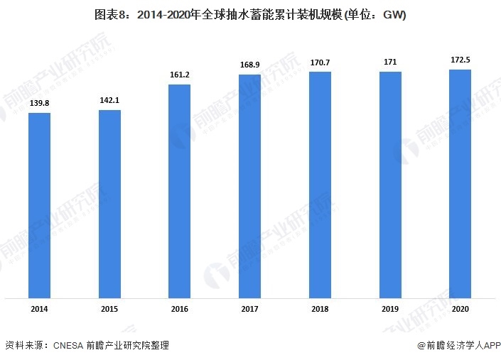 2015-2020年,全球抽水蓄能的累計裝機規(guī)模呈增長趨勢。截至2020年底,全球抽水學(xué)能累計裝機規(guī)模為172.5GW,同比增長0.9%。在全球儲能市場上占據(jù)領(lǐng)先地位。