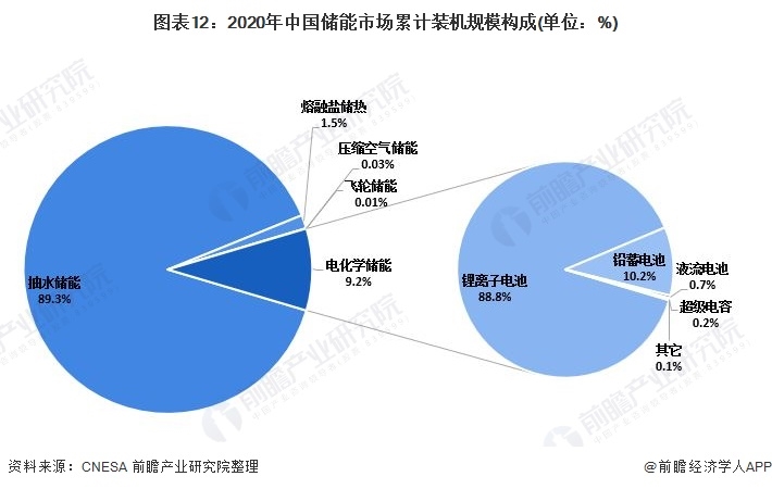 截至2020年底,在中國儲能市場中,抽水蓄能的累計裝機規(guī)模最大,占比達到了89.3%;其次是電化學(xué)儲能,裝機規(guī)模占比為9.2%。熔融鹽儲熱裝機規(guī)模占比為1.5%;壓縮空氣儲能和飛輪儲能裝機規(guī)模占比都小于0.1%。