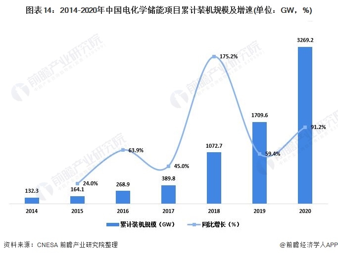 電化學(xué)儲能是利用化學(xué)電池將電能儲存起來并在需要時釋放的儲能技術(shù)及措施。在中國新能源發(fā)電規(guī)模大幅增長、鋰電池成本持續(xù)下降推動下,中國電化學(xué)儲能裝機規(guī)模一直保持高速增長的趨勢。截至2020年底,電化學(xué)儲能累計裝機規(guī)模為3269.2MW,同比增長91.2%。未來五年,隨著分布式光伏、分散式風(fēng)電等分布式能源的大規(guī)模推廣,電化學(xué)儲能行業(yè)將面臨更廣闊的市場機遇。