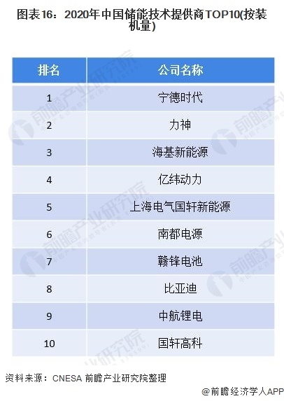 根據(jù)《儲能產(chǎn)業(yè)研究白皮書2021》數(shù)據(jù)顯示,2020年,中國新增投運的電化學(xué)儲能項目中,裝機規(guī)模排名前十位的儲能技術(shù)提供商,依次為寧德時代、力神、?;履茉础|緯鋰能、上海電氣國軒新能源、南都電源、贛鋒電池、比亞迪、中航鋰電和國軒高科。