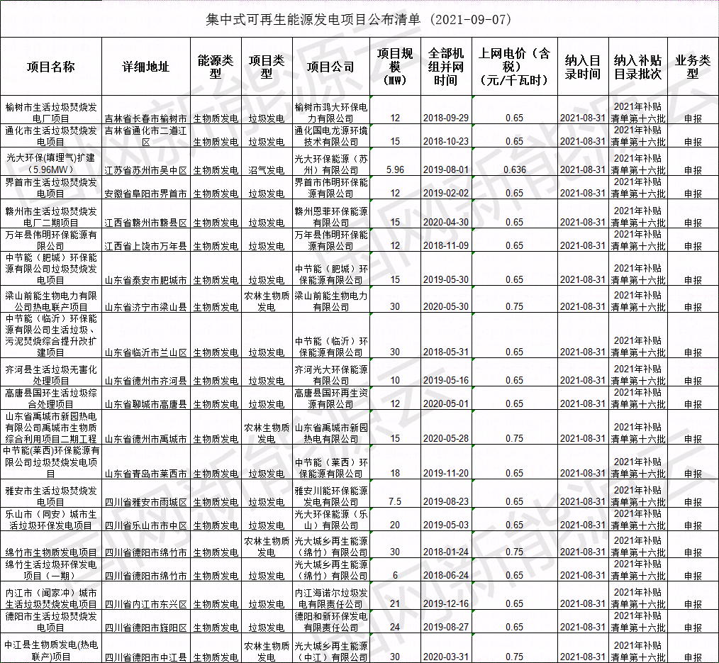 2021年8月31日,我公司已將完成公示的2021年第十六批可再生能源發(fā)電項目補貼項目清單上報國家主管部門,現(xiàn)將十六批可再生能源發(fā)電并網(wǎng)項目清單詳情盤點如下: