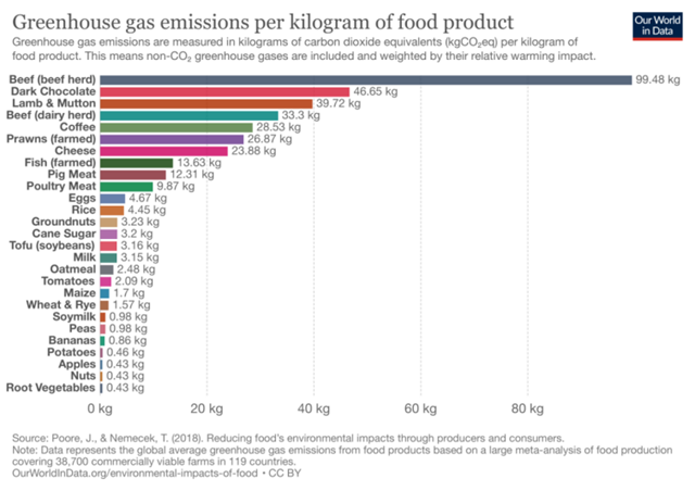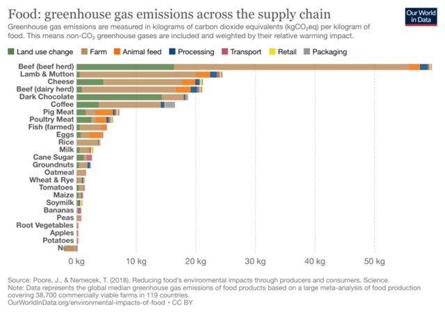 據(jù)牛津大學(xué)開發(fā)的Our World in Data平臺中,我們從中選取了一些中國人經(jīng)常食用的食品種類,統(tǒng)計后得出下圖,位于圖表底部的多是水果與植物性食物,它們的碳排放普遍偏低,比動物性食物低10至50倍。其次是糖,牛奶,雞蛋,家禽等。碳排放較高的是黑巧克力,咖啡以及肉類。由下往上最終我們看到,位列碳排放之首的是牛肉,遠(yuǎn)遠(yuǎn)超出其它各項食品??梢钥闯?,那些經(jīng)過最少加工且對人體健康益處大的食物通常對環(huán)境的危害也很小,比如谷物,水果,蔬菜,豆類,堅果,橄欖油等食品。相反,紅肉等具有高疾病風(fēng)險的食物對環(huán)境影響也是最大的。同樣的,加工過程復(fù)雜的一些食品比如咖啡和巧克力等則對健康有害的同時也會對環(huán)境造成不良影響。由此可見,飲食健康也意味著可持續(xù)健康。(圖3)