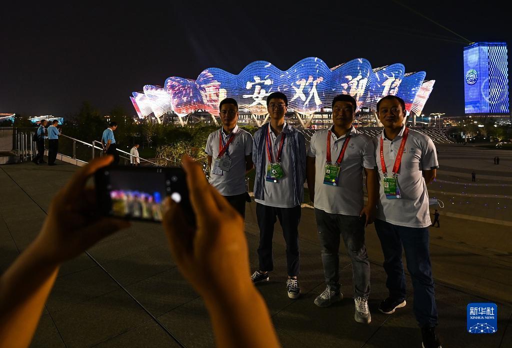 這是9月15日開幕式前工作人員在西安奧體中心體育場(chǎng)外合影。當(dāng)日,第十四屆全國(guó)運(yùn)動(dòng)會(huì)開幕式在西安奧體中心體育場(chǎng)舉行。新華社記者 王曦 攝