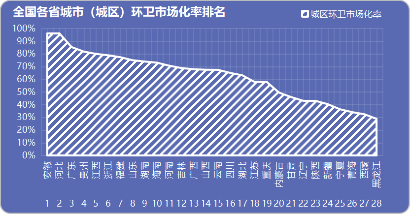 全國2851個(gè)區(qū)縣(縣級區(qū)劃)中,城區(qū)環(huán)衛(wèi)市場化推進(jìn)情況不盡相同,呈現(xiàn)出“東高西低”的總特征。如安徽、河北兩省的城區(qū)環(huán)衛(wèi)市場化完成率高達(dá)96%,寧夏、青海、西藏、黑龍江四省的城區(qū)環(huán)衛(wèi)市場化完成率不足40%。