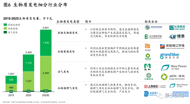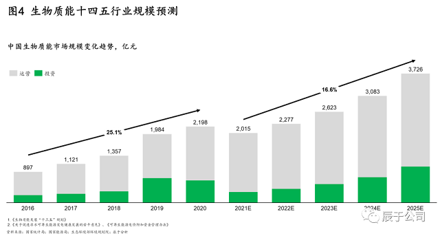 辰于預(yù)測,隨著“30·60”雙碳目標(biāo)引導(dǎo)下的能源革命和能源轉(zhuǎn)型,以及相關(guān)政策支持(例如明確對存量、增量的生物質(zhì)發(fā)電項(xiàng)目將按照新增不欠的原則由國家繼續(xù)給予電價補(bǔ)貼,并鼓勵金融機(jī)構(gòu)按照市場化原則對列入補(bǔ)助項(xiàng)目清單的企業(yè)予以支持),生物質(zhì)能市場“十四五”期間的投資和運(yùn)營規(guī)模將持續(xù)提升,復(fù)合增長率16.6%,到2025年達(dá)到3700億元規(guī)模(見圖4)。投資方面,預(yù)計(jì)生物天然氣投資額最高,增長也最快;運(yùn)營方面,生物質(zhì)發(fā)電占比最高,但生物天然氣的增速最快。