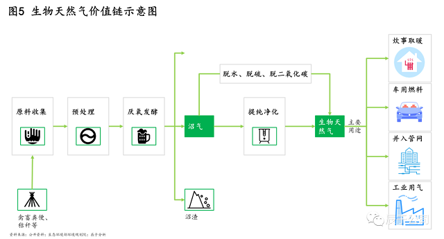 生物天然氣是指通過對秸稈、人畜糞便等生物質(zhì)經(jīng)過發(fā)酵形成沼氣后,進(jìn)一步提純獲得的天然氣,作為天然氣的替代品用于家庭炊事取暖、車用燃料、工業(yè)用氣等領(lǐng)域,它的價值鏈較長(見圖5)。