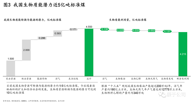 正因如此,我國生物質(zhì)能還處于發(fā)展的初級階段,潛力巨大。根據(jù)公開資料測算,當(dāng)前我國生物質(zhì)能每年可以利用的量將近5億噸標(biāo)準(zhǔn)煤,相較之下目前已經(jīng)利用的量只有不到0.4億噸標(biāo)準(zhǔn)煤,生物質(zhì)能是一座待持續(xù)發(fā)掘的能源寶庫,行業(yè)還有十幾倍的增長空間。