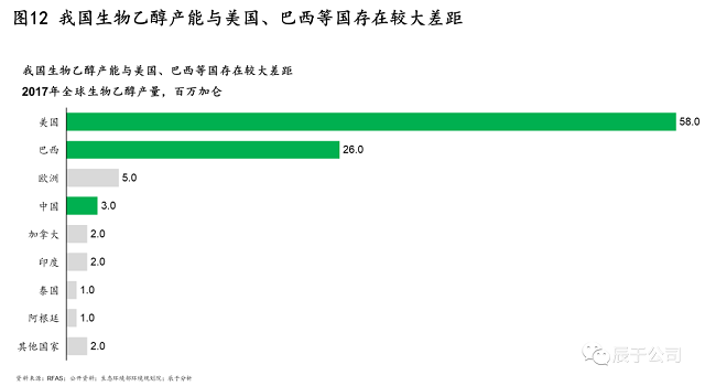 我國發(fā)展生物乙醇的總思路是“核準(zhǔn)生產(chǎn)、定向流通、封閉運(yùn)行、有序發(fā)展”,生物乙醇的生產(chǎn)、流通、銷售等都在嚴(yán)格限制范圍內(nèi)進(jìn)行,目標(biāo)到2025年達(dá)到688萬噸產(chǎn)量(2020年400萬噸)。但這一數(shù)字與美國、巴西等國家相比差距較遠(yuǎn),2017年全球生物乙醇產(chǎn)量中,中國的產(chǎn)量只有美國的二十分之一(見圖12)。