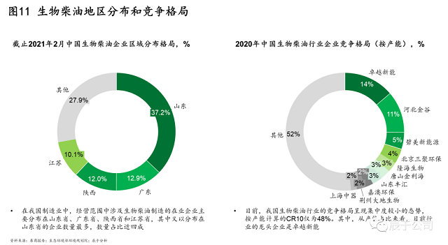 在銷售應(yīng)用上,國內(nèi)的主要渠道是出口、交通燃料、化工等,出口是拉動行業(yè)發(fā)展的主要渠道,2019年出口占產(chǎn)量的比例達(dá)到80%。國內(nèi)需求的打開是行業(yè)發(fā)展的最大希冀,其中最有望打開的市場是交通燃料領(lǐng)域——生物柴油強(qiáng)制添加政策。部分城市已經(jīng)開始在試點(diǎn),上海市2013年開始在公交車上實(shí)行B5標(biāo)準(zhǔn)(添加比例5%)?,F(xiàn)在國家已開始全國范圍進(jìn)行B5 強(qiáng)制添加標(biāo)準(zhǔn)的意見征求,并有望隨著雙碳目標(biāo)深入推進(jìn)提升到B10。若政策落地實(shí)施,將產(chǎn)生450萬噸~1000萬噸的產(chǎn)能缺口。