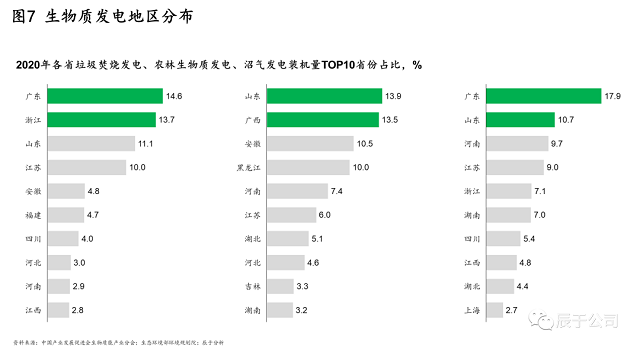 在地區(qū)分布上,各類型的生物質(zhì)發(fā)電集中于華東華南地區(qū),但各地區(qū)側(cè)重點(diǎn)有所不同。截至2020年底,垃圾焚燒發(fā)電集中在廣東省、浙江省、山東省、江蘇省、安徽省等地區(qū),合計(jì)占全國累計(jì)裝機(jī)容量的54%;農(nóng)林生物質(zhì)發(fā)電主要集中于山東省、湖北省、安徽省、黑龍江省、河南省,合計(jì)占比達(dá)到55.3%;沼氣發(fā)電主要集中于廣東省、山東省、河南省、江蘇省、浙江省,合計(jì)占比達(dá)到54.3%(見圖7)。