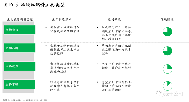 生物液體燃料是指把生物質(zhì)經(jīng)過發(fā)酵提純或者生化合成的方式制造成乙醇或油類等液體燃料,目前主要包括生物柴油、生物乙醇、生物航煤、生物甲醇等類型,生產(chǎn)制造方式各異,其中生物柴油、生物乙醇發(fā)展較為成熟(圖10)。