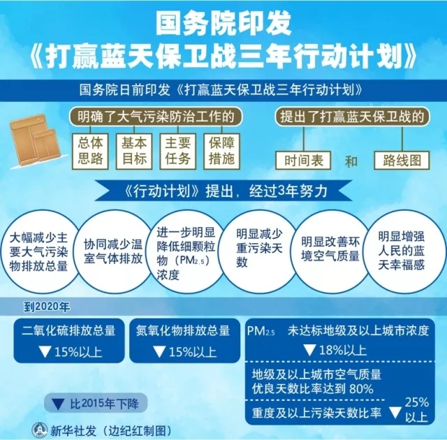 經(jīng)李克強(qiáng)總理簽批,國(guó)務(wù)院日前印發(fā)《打贏藍(lán)天保衛(wèi)戰(zhàn)三年行動(dòng)計(jì)劃》(以下簡(jiǎn)稱《行動(dòng)計(jì)劃》),明確了大氣污染防治工作的總體思路、基本目標(biāo)、主要任務(wù)和保障措施,提出了打贏藍(lán)天保衛(wèi)戰(zhàn)的時(shí)間表和路線圖。
