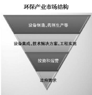 第一,以政府需求為主的市場結構呈現(xiàn)倒三角形。倒三角形最上層是數(shù)量眾多且以民營企業(yè)為主的設備制造、藥劑生產(chǎn)等上游環(huán)節(jié);中間層是數(shù)量中等,也以民營企業(yè)為主的設備集成、技術解決方案、工程實施等中游環(huán)節(jié);最底層是數(shù)量最少以國有企業(yè)為主、從事投資和運營業(yè)務的下游環(huán)節(jié)。這一倒三角市場結構的支點是政府環(huán)境治理需求,這樣的市場結構往往經(jīng)不起“風吹草動”。只有政府需求端變寬一點,比如出現(xiàn)深度處理需求,才能促使企業(yè)形成差異化格局,衍生出不同發(fā)展路徑。