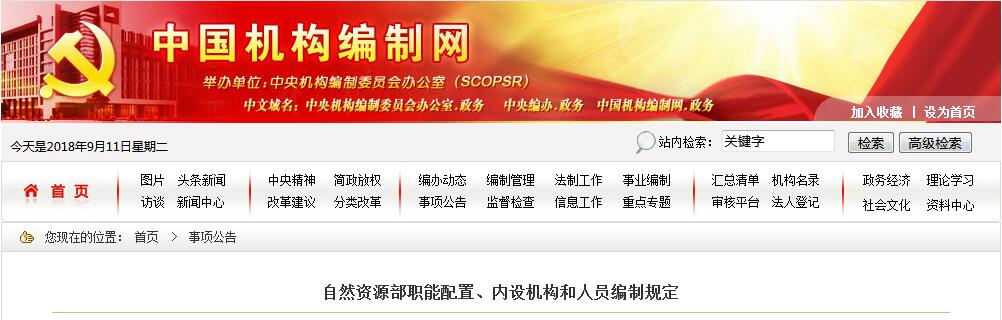 9月11日,中國機構(gòu)編制網(wǎng)發(fā)布了自然資源部三定方案。詳情如下:
