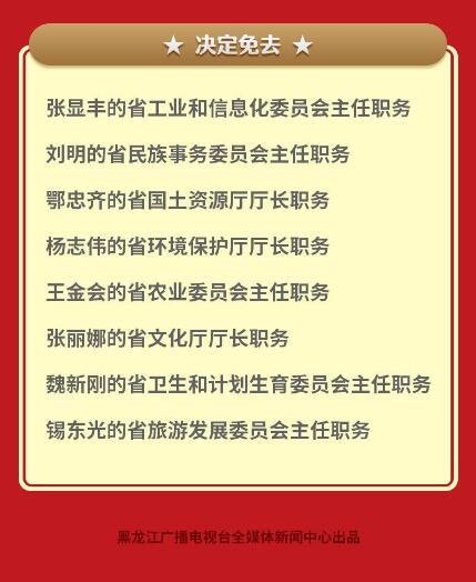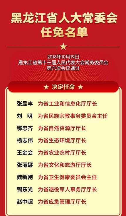 2018年10月19日,黑龍江省第十三屆人民代表大會常務委員會第六次會議通過黑龍江省人大常委會任免名單。