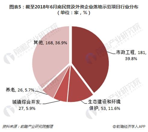 從民營(yíng)企業(yè)參與行業(yè)來(lái)看,截至2018年6月底,866個(gè)落地示范項(xiàng)目中,民營(yíng)的非聯(lián)合體項(xiàng)目以及含民營(yíng)、港澳臺(tái)及外資的聯(lián)合體兩類(lèi)項(xiàng)目數(shù)合計(jì)455個(gè),占落地項(xiàng)目數(shù)的52.5%。民企參與的行業(yè)涵蓋全部19個(gè)行業(yè),其中市政工程181個(gè),占比39.8%;生態(tài)建設(shè)和環(huán)境保護(hù)53個(gè),占比11.6%;城鎮(zhèn)綜合開(kāi)發(fā)27個(gè),占比5.9%;養(yǎng)老26個(gè),占比5.7%,其余皆為25個(gè)以下。
