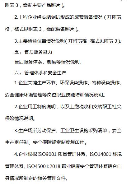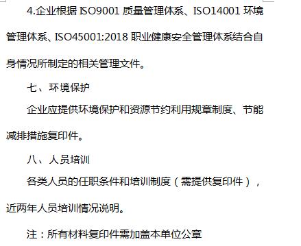 (十四)企業(yè)應(yīng)具備ISO9001質(zhì)量管理體系、ISO14001環(huán)境管理體系、ISO45001:2018職業(yè)健康安全管理體系,結(jié)合企業(yè)經(jīng)營生產(chǎn)和產(chǎn)品使用要求等方面的實際情況,建立相應(yīng)的管理體系。