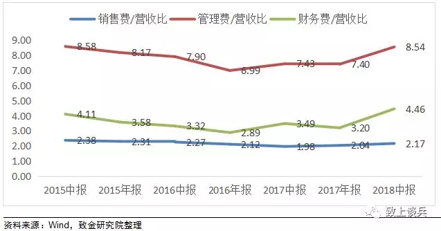 期間費用率方面,2018年上半年整體銷售費用率同比小幅上漲至2.17%,管理費用率同比大幅上漲至8.54%,財務費用率同比上漲至4.46%,管理費率和財務費率均漲至較高位。