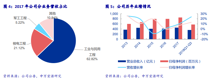 核電建設(shè)行業(yè)絕對龍頭,業(yè)績穩(wěn)健,積極擴張民用與工業(yè)領(lǐng)域。公司是中國核建集團(tuán)旗下核電工程商,實際控制人為國資委。截至目前公司承建我國絕大多數(shù)核電站的核島工程,系我國核電建設(shè)領(lǐng)域領(lǐng)軍企業(yè),在國內(nèi)核電工程市場長期占據(jù)絕對主導(dǎo)地位。近年來公司依托技術(shù)優(yōu)勢,積極拓展工業(yè)與民用工程,2017 年工業(yè)與民用業(yè)務(wù)貢獻(xiàn) 55.96%的毛利,較 2011 年增長 16.11 個百分點。公司整體業(yè)績穩(wěn)健,2012-2017 年歸母凈利潤復(fù)合增速達(dá) 12.38%。2016 年公司順利登陸 A 股,募資加碼建設(shè)核電工程。截至 2017 年底,公司在國內(nèi)已建成核電機組 39 臺,在建 19 臺;在國外已建成核電機組 4 臺,在建 2 臺。
