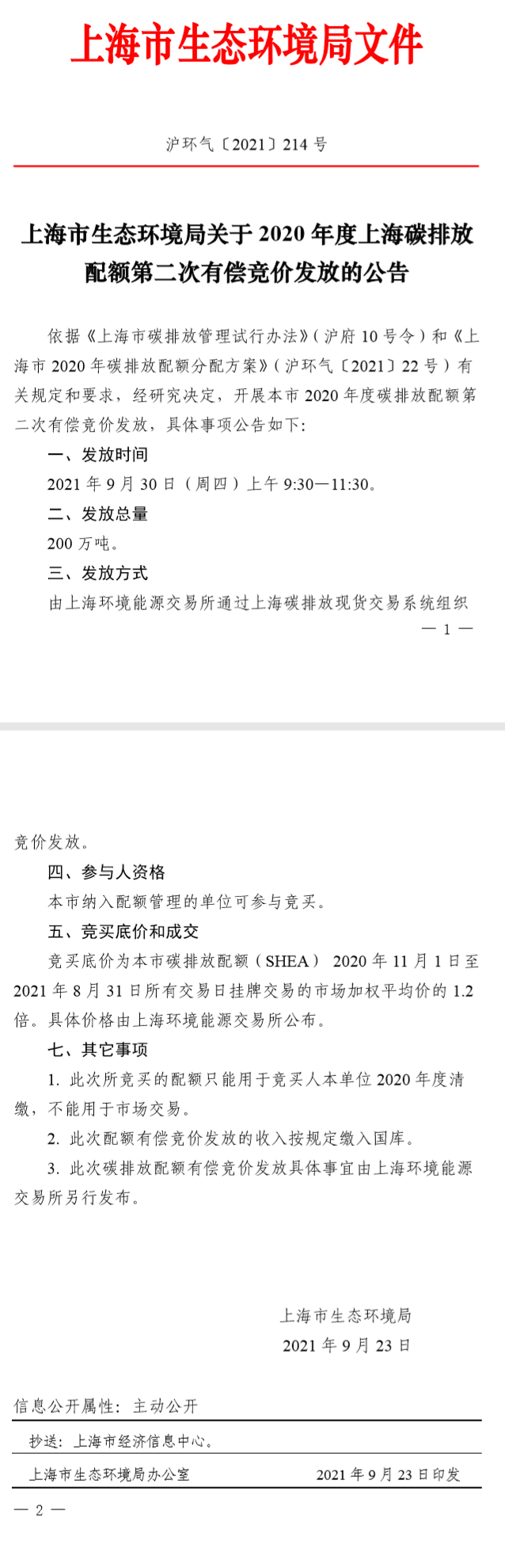 上海市生態(tài)環(huán)境局關(guān)于2020年度上海碳排放配額第二次有償競(jìng)價(jià)發(fā)放的公告 滬環(huán)氣〔2021〕214號(hào) 依據(jù)《上海市碳排放管理試行辦法》(滬府10號(hào)令)和《上海市2020年碳排放配額分配方案》(滬環(huán)氣〔2021〕22號(hào))有關(guān)規(guī)定和要求,經(jīng)研究決定,開展本市2020年度碳排放配額第二次有償競(jìng)價(jià)發(fā)放,具體事...