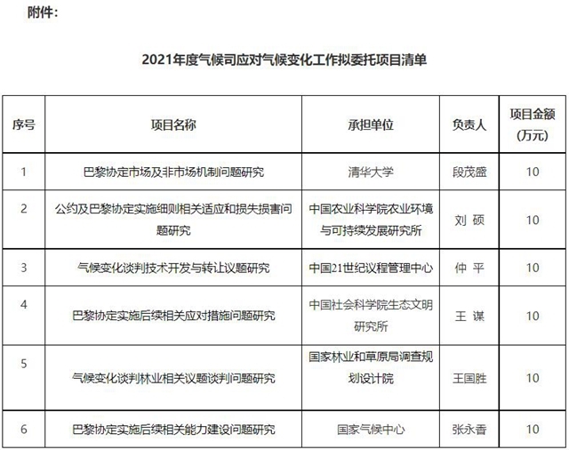 關(guān)于2021年度應對氣候變化工作擬委托項目的公示各有關(guān)單位: 根據(jù)《生態(tài)環(huán)境部財政撥款項目委托業(yè)務費管理辦法》(科財函〔2019〕226號)要求,經(jīng)申報匯總、形式審核、專家評審并報應對氣候變化司領(lǐng)導審定,擬立項開展2021年度應對氣候變化工作委托項目共6項,現(xiàn)將項目名單公示如下: 一、公示內(nèi)容 氣候...