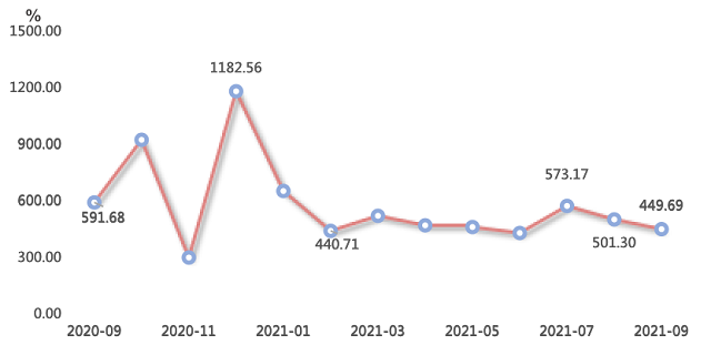 一、浙江省排污權(quán)交易指數(shù)分析 浙江省排污權(quán)交易指數(shù)震蕩走跌。2021年9月,排污權(quán)交易指數(shù)延續(xù)下行趨勢(shì),收?qǐng)?bào)于449.69點(diǎn),環(huán)比下跌10.29%,與上年同期相比下降24.00%。 四項(xiàng)排污權(quán)指標(biāo):化學(xué)需氧量收?qǐng)?bào)于697.88點(diǎn)(對(duì)應(yīng)價(jià)格27915.06元/噸·年)、氨氮收?qǐng)?bào)于557....