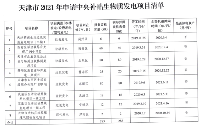 關(guān)于我市2021年申請(qǐng)中央補(bǔ)貼生物質(zhì)發(fā)電項(xiàng)目清單的公示 為促進(jìn)生物質(zhì)發(fā)電高質(zhì)量發(fā)展,按照國(guó)家發(fā)展改革委、財(cái)政部、國(guó)家能源局印發(fā)的《2021年生物質(zhì)發(fā)電項(xiàng)目建設(shè)工作方案》(發(fā)改能源〔2021〕1190號(hào))要求,積極組織我市生物質(zhì)發(fā)電項(xiàng)目申報(bào)補(bǔ)貼。 經(jīng)過項(xiàng)目單位申報(bào)、申報(bào)信息核查等程序,現(xiàn)將《天津市20...